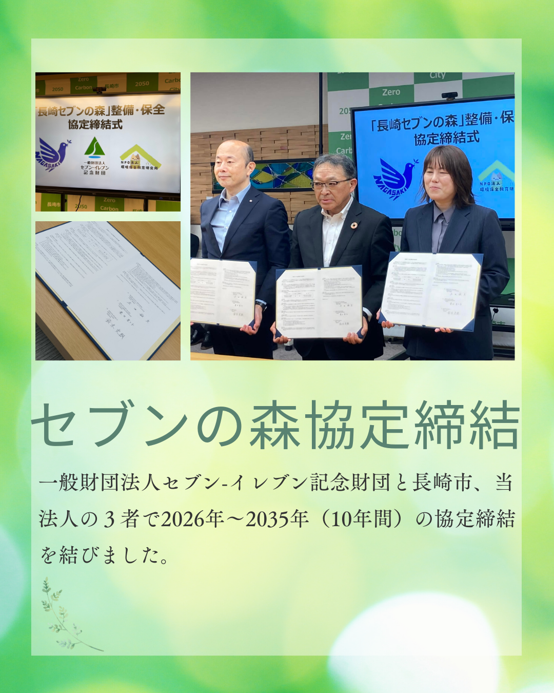 2026年1月23日、一般財団法人セブン‐イレブン記念財団・長崎市・当法人の3者で、2026年〜2035年の10年間にわたる協定を締結しました。